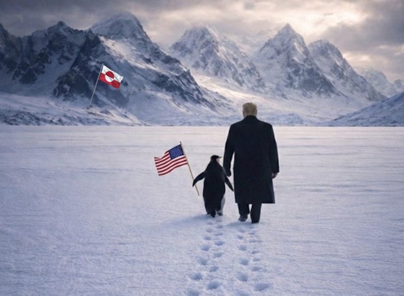 Beyaz Saray, ABD Başkanı Donald Trump'ın bir penguenle birlikte buzlu dağlara doğru yürüdüğü ve Grönland bayrağı bulunan yapay zekâ tarafından oluşturulmuş bir resim yayımladı.
