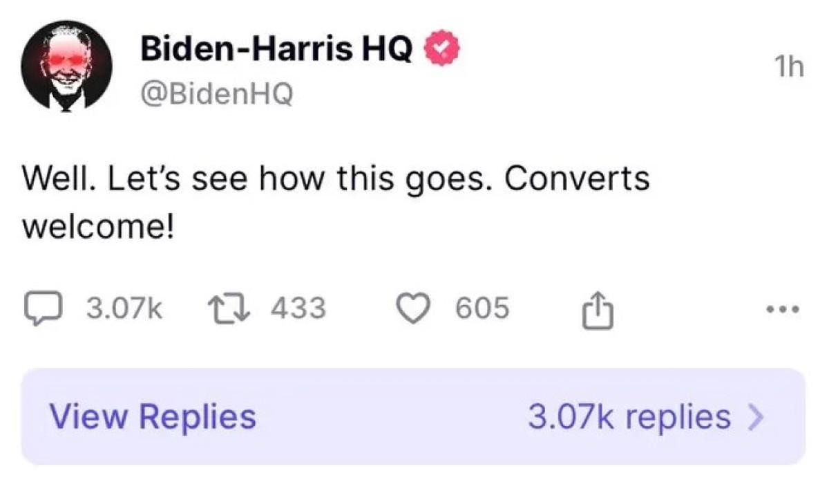 Biden'ın kampanya ekibinin X'ten de "Truth Social'a yeni katıldık, çünkü çoğunlukla bunun çok komik olacağını düşündük." paylaşımını yaptı.