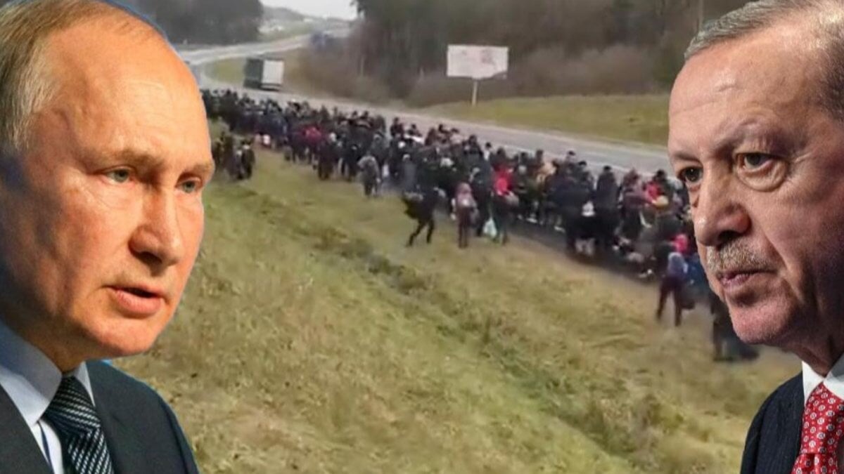 Göçmenlere yer verilen haberin fotoğrafında Cumhurbaşkanı Recep Tayyip Erdoğan ile Rusya Devlet Başkanı Vladimir Putin de yer aldı.