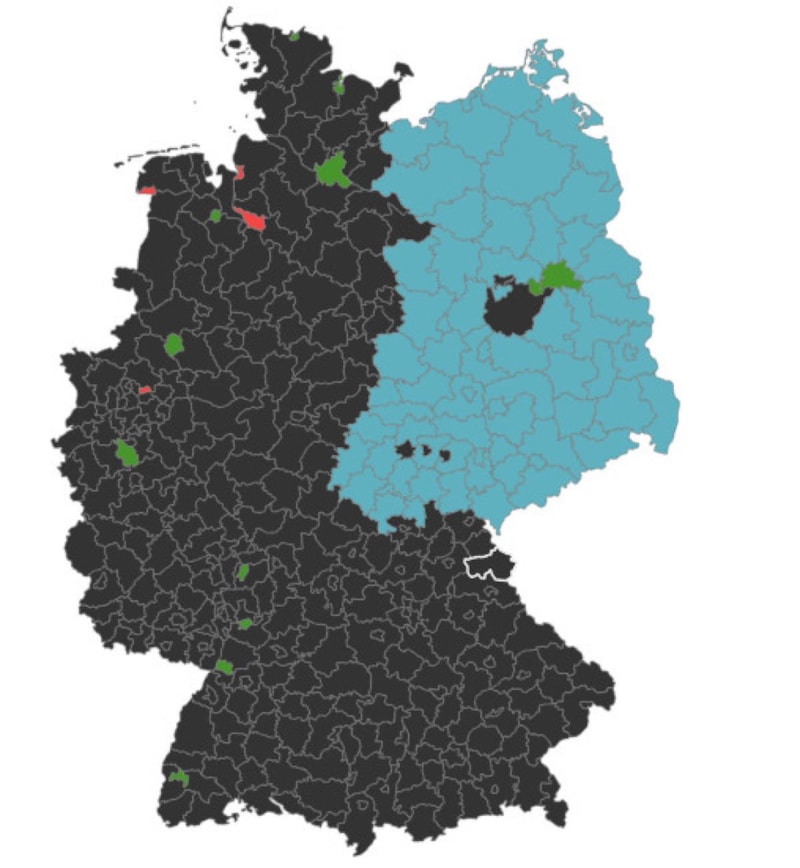 Sonuçlara göre eski federal eyaletlerde, CDU ve CSU'nun Sylt ile Oberammergau arasındaki seçim bölgelerinin büyük bir kısmını kazandığına dikkat çekildi.