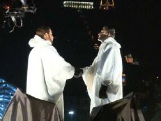 Tiflis'teki Rike Park'ın içinde yer alan Barış Köprüsü'nde 43 saat boyunca tokalaşan Mersinli tiyatro sanatçısı Deniz Barış ve Erivan Pandomim Tiyatrosu'ndan Ohannes Acinyan, Başbakan Recep Tayyip Erdoğan'ın ucube olarak nitelediği Kars'taki İnsanlık Anıtı'na göndermede bulundu.