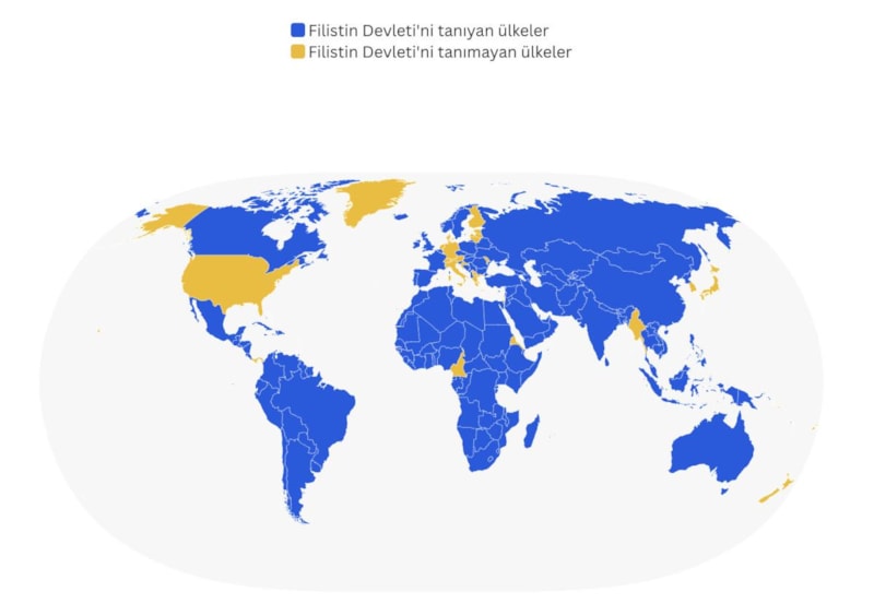 Birleşmiş Milletler'e üye 193 ülkenin 150'si, Filistin'i devlet olarak tanıyor.