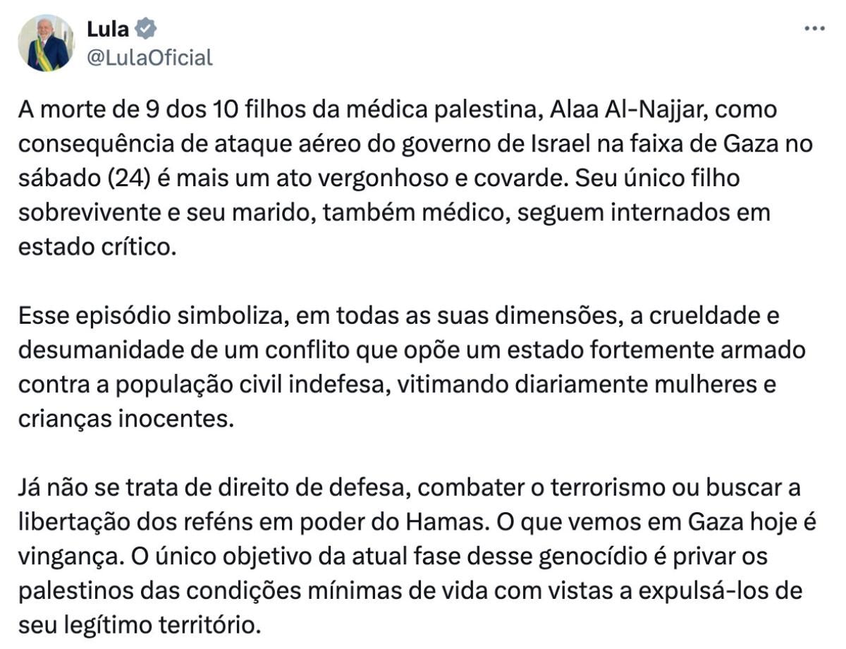 Lula, X sosyal medya platformu üzerinden yaptığı paylaşımda, İsrail'in saldırısında 10 çocuğundan 9'unu kaybeden Filistinli kadın doktor Neccar'a şu ifadelerle dikkati çekti: