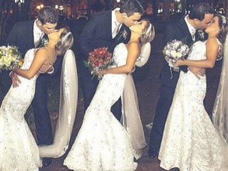29 yaşındaki üçüzler Rafaela, Rochele ve Tagiane Bini toplu düğünde sadece yakalarında ufak farklar olan birbirine eş gelinlikler giydi. Saç ve makyajlarını da aynı şekilde yaptıran gelinler "farklı olmaya çalıştıklarını ancak hep aynı modelleri beğendiklerini" söyledi.