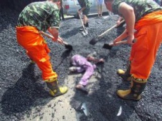 Kamyon sürücüsünün ifadesine göre, motosiklet sürücüsü bir anda önüne çıkınca sertçe fren yapmak zorunda kaldı ve kamyon devrildi. Motosiklet sürücüsü de yere düşerken, kamyondaki 10 ton kaynar sıcaklıktaki asfalt talihsiz sürücünün üzerine döküldü. Görgü tanığı Liu Jin "Asfalt motosikletteki adamın üzerine döküldü. Yanık kokusunu alabiliyordunuz. Sürücünün kulak tırmalayan çığlıklarını duyduk" diyerek yaşanan dehşeti anlattı.