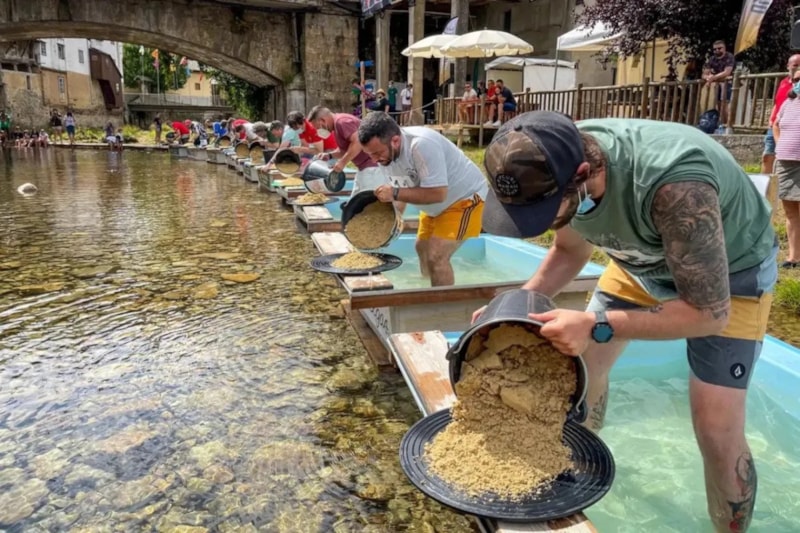Oviedo'dan yapılan kısa yolculuk sonrası ulaşılan Nalvegas'ta misafirlere altın yıkama tavaları veriliyor.