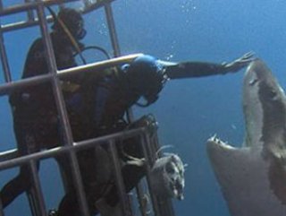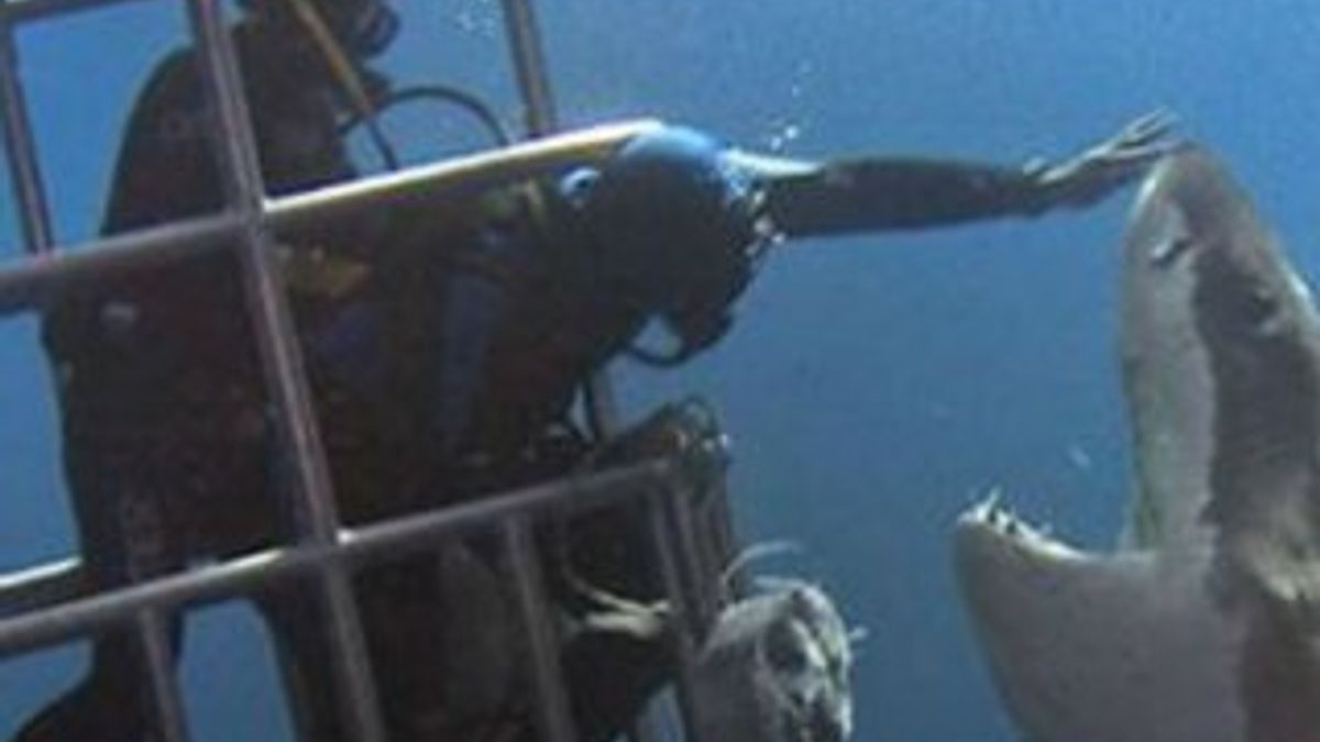 Bölgedeki köpekbalıklarının ilgisini çekmek için kafes dışına yüklü miktarda yem bırakan dalgıçlardan biri, kafesin yanına gelen büyük beyaz köpekbalığının burnunu okşadı. Dalgıcın cesareti sosyal medyada çok konuşulurken, “Verilmiş sadakası varmış, köpekbalığı ısırmamış” yorumları yapıldı.