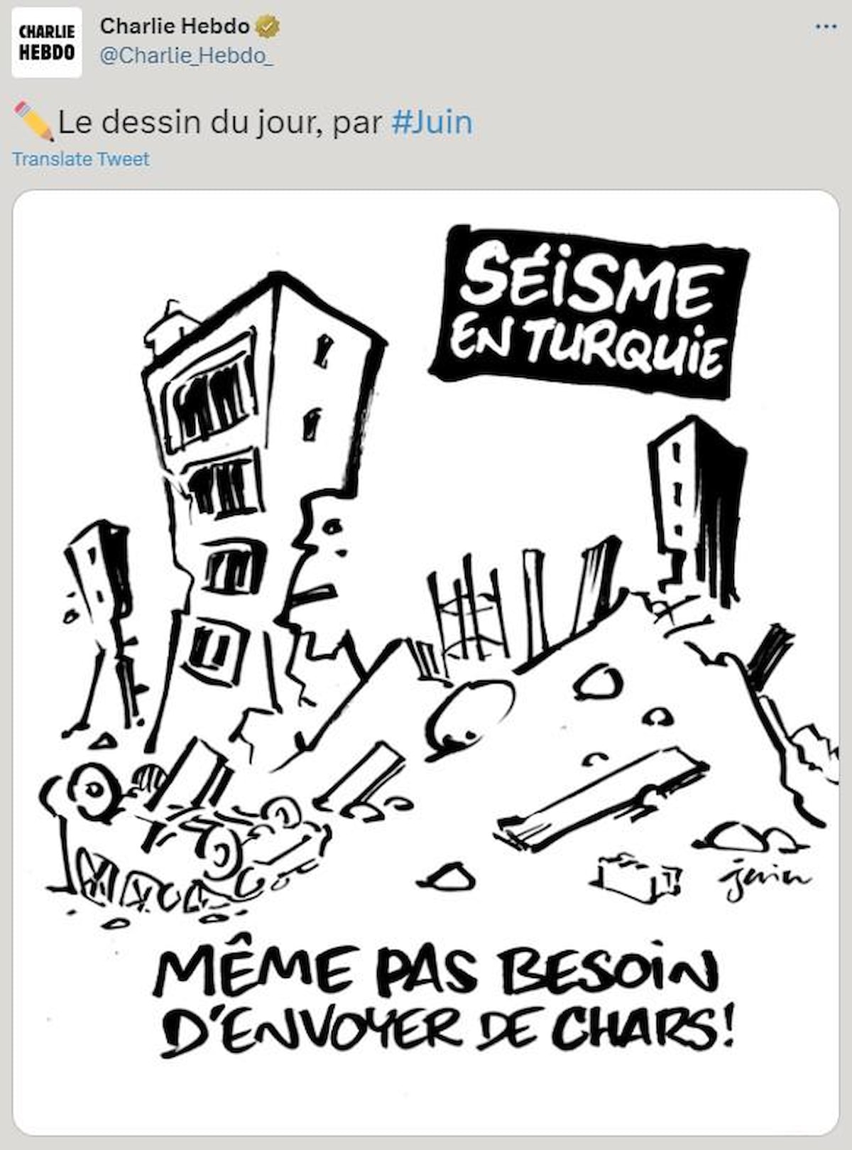İslam ve Müslüman karşıtı yayınlarıyla bilinen Fransa merkezli Charlie Hebdo dergisi ise can kayıplarının yaşandığı sarsıntılarla alay etmeye çalıştı.