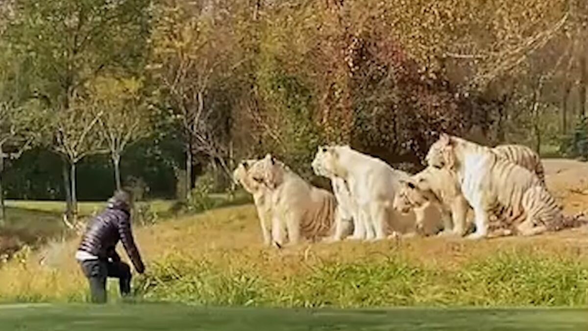 Çin’in başkenti Pekin’de bulunan Vahşi Yaşan Park’ında 23 Ekim günü bir turist, sürüş turu sırasında beyaz kaplanların muhafaza edildiği alana girdi.
