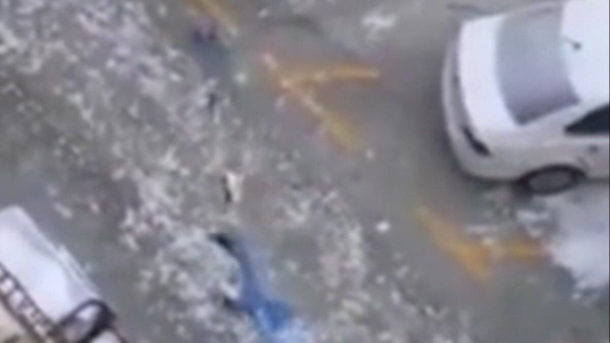 Evin penceresinden sokağa kadar uzanan çarşaflar ile köpeğini gezintiye çıkaran adam, o anları da cep telefonu kamerasıyla kayda aldı.