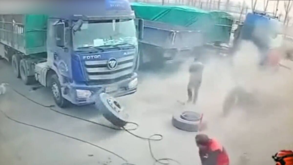Lastik, içindeki havanın basıncıyla yerinden fırladı. O sırada işlemi izlemekte olan işçiyi sıyırarak tıra çarptı.