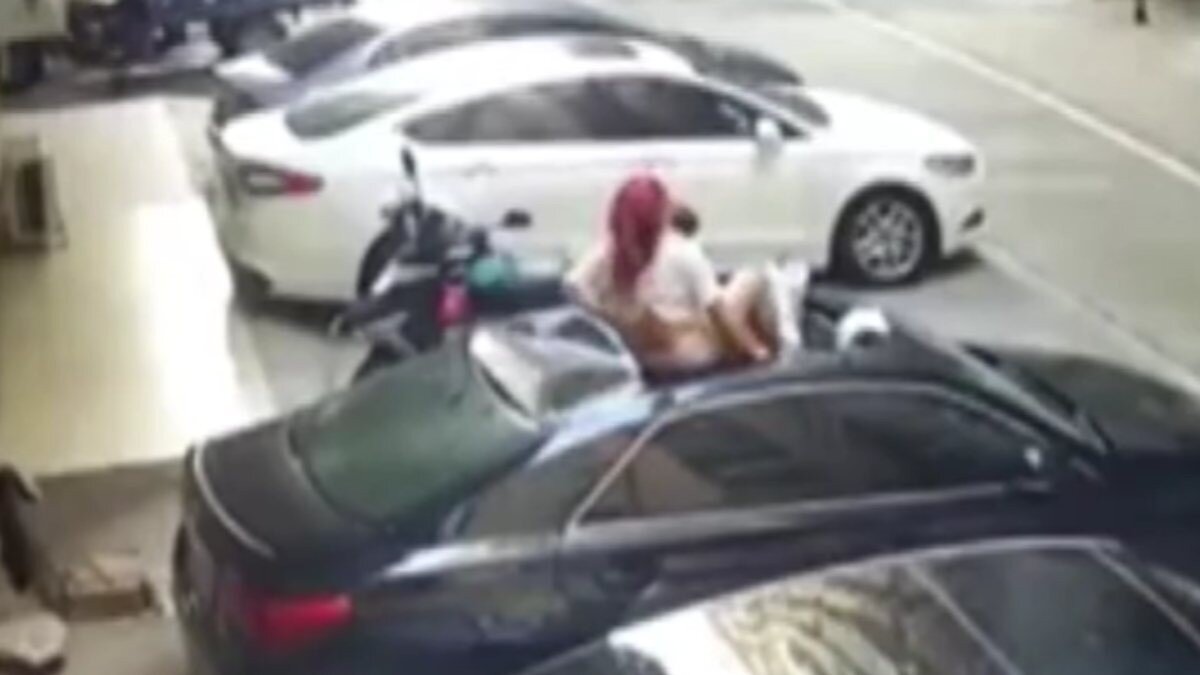 İç çamaşırlı genç kadın, bir süre sonra dengesini kaybedip aşağı düştü. Park halinde duran otomobilin üzerine düşen kadın, araçta hasara sebep oldu. Aracın tavan kısmı çökerken, kadın acı içinde belini tutmaya başladı. Yardımına ise erkek arkadaşı koştu.