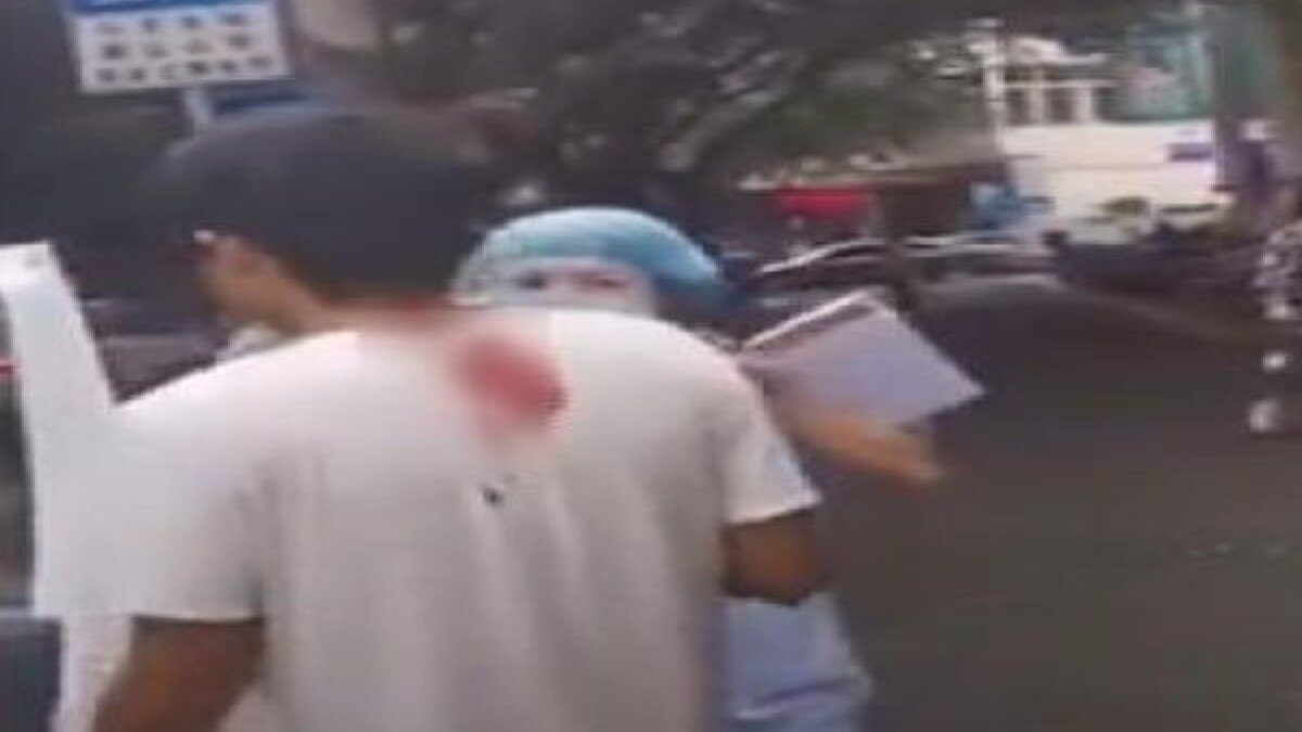 Çin’in Çongçing kentinde, saldırıya uğrayan bir adamın başına bıçak saplandı.