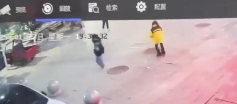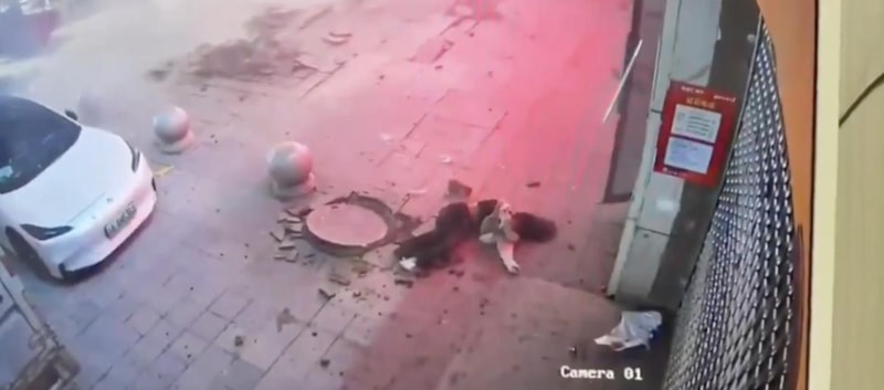Rögar kapağı ile birlikte metrelerce havaya uçan kız, 3 saniye sonra sırt üstü bir şekilde beton zemine geri düştü.