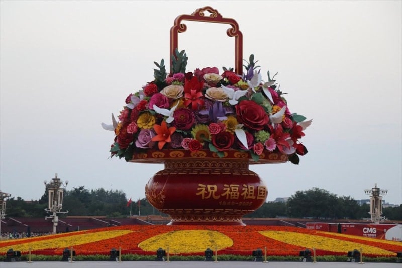 Çin Halk Cumhuriyeti’nin kurucu lideri Mao Zıdong’un portresinin yer aldığı, “Yasak Şehir” olarak bilinen eski İmparatorluk Sarayı’nın güney duvarı aydınlatıldı. Meydanın ortasına ise Ulusal Gün’e özel olarak hazırlanan dev çiçek buketi yerleştirildi.