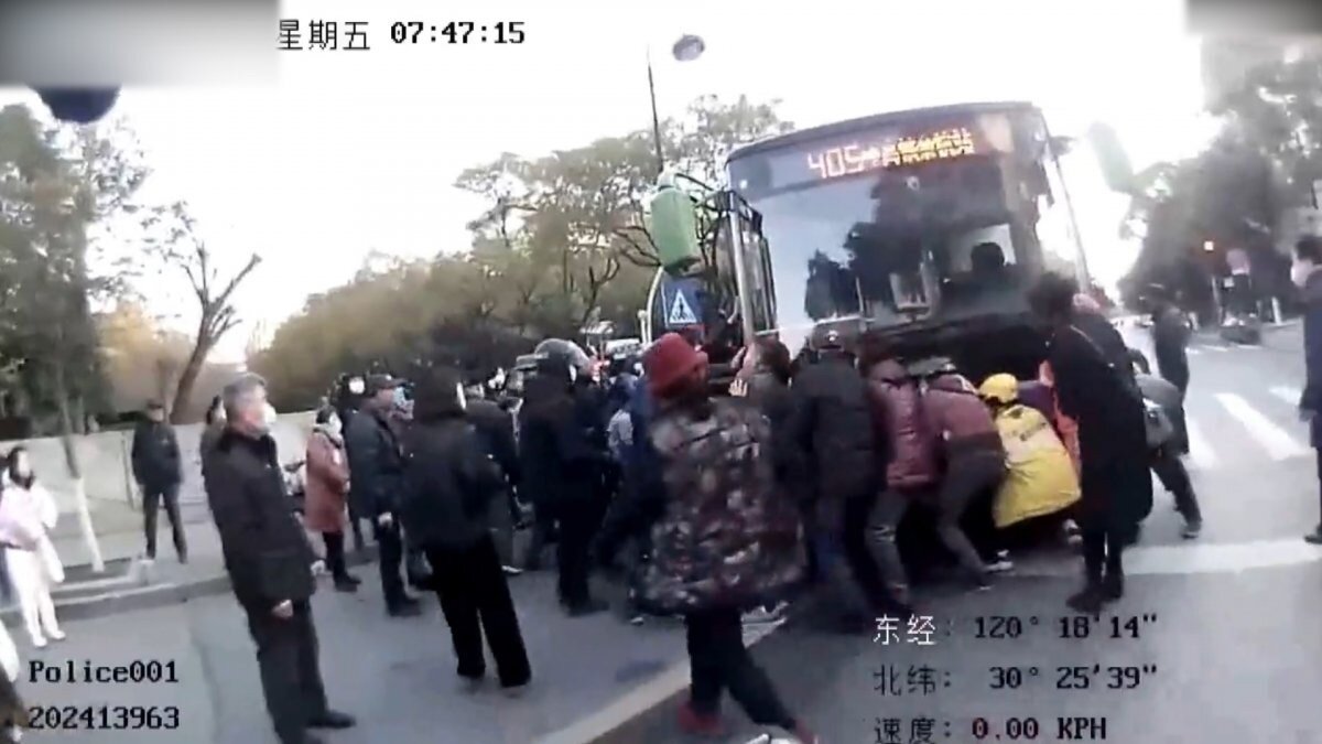 Kalabalık grup, Çinli adamı kurtarmak için otobüsü birlikte kaldırdı.