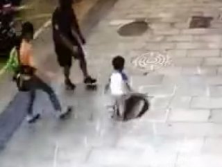 Ailesinin birkaç adım önünden ilerleyen çocuk, kapağı kapalı olan rögara yöneliyor.