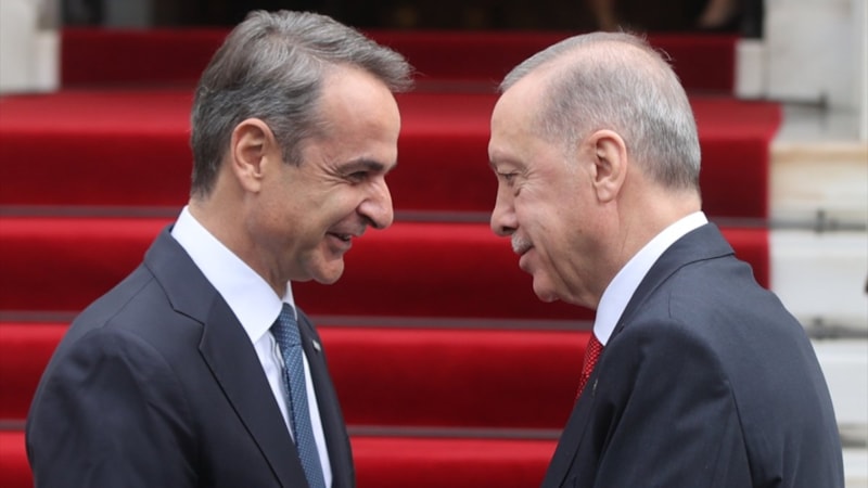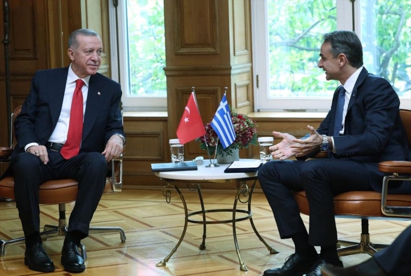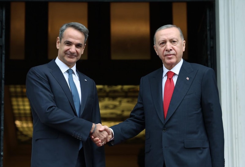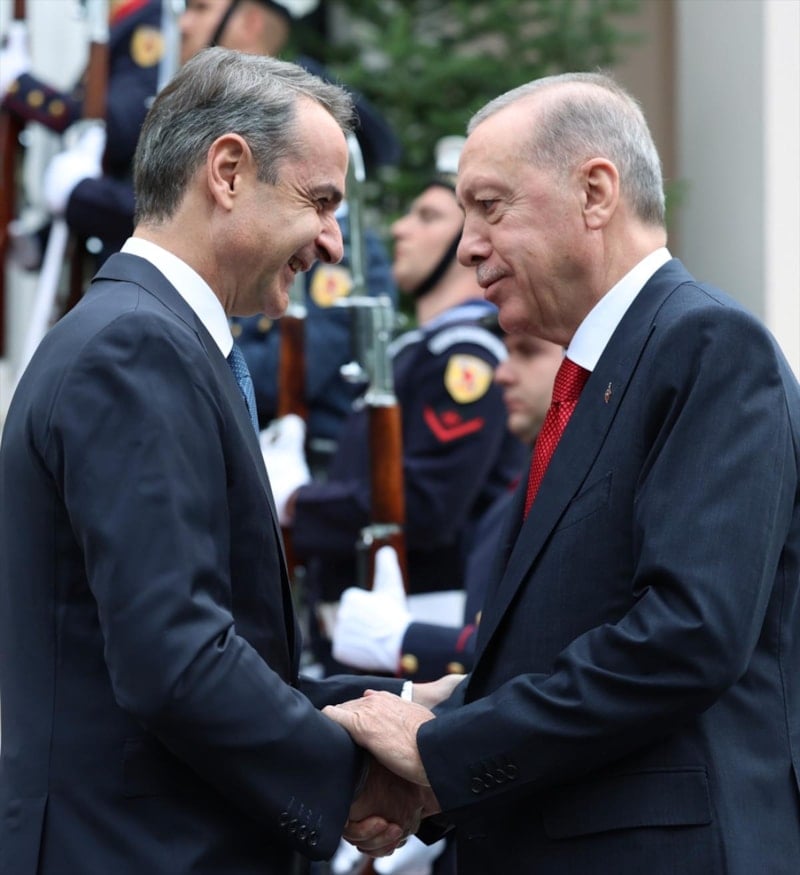 Miçotakis, burada Erdoğan'ı karşıladı. İki lider el sıkışırken, taraflar arasındaki sıcak diyalog kameraya yansıdı.