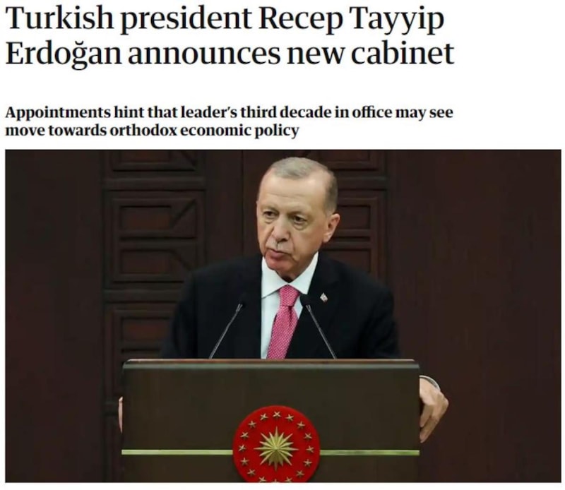 The Guardian, "Türkiye Cumhurbaşkanı Recep Tayyip Erdoğan, cumartesi günü göreve başlama töreninin ardından yeni kabinesini açıkladı." ifadesini kullandı.