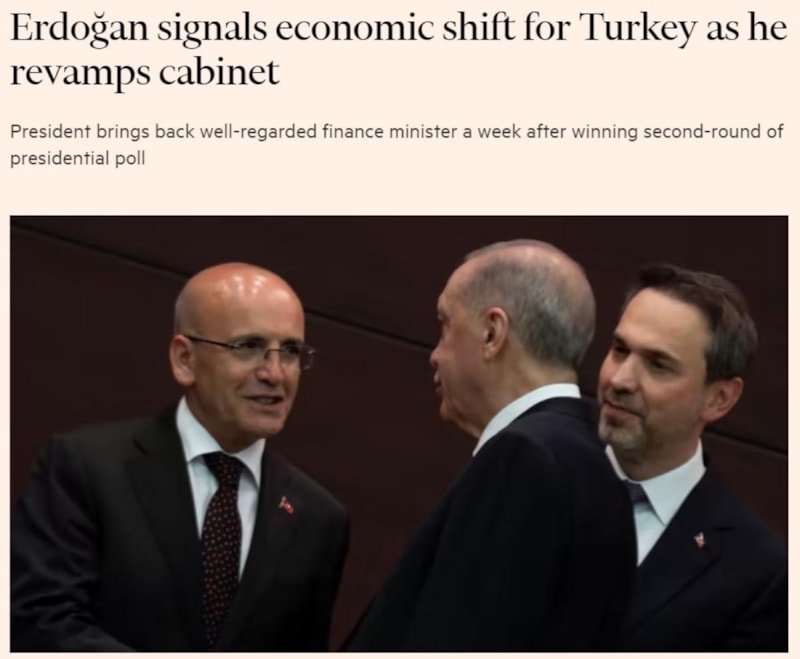 Erdoğan'ın, Şimşek ile birlikte ekonomi alanında yeni bir dönemin sinyalini verdiğini ifade eden Financial Times, "Cumhurbaşkanı, seçimin ikinci turunu kazandıktan bir hafta sonra saygın Maliye Bakanı'nı geri getirdi." dedi.