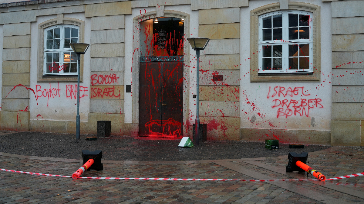 Filistin yanlısı protestocular, İsrail’in Gazze’ye yönelik saldırılarına karşı duydukları öfkeyi dile getirmek amacıyla Danimarka’nın başkenti Kopenhag’daki Dışişleri Bakanlığı binasının duvarlarına kırmızı boya sıktı.