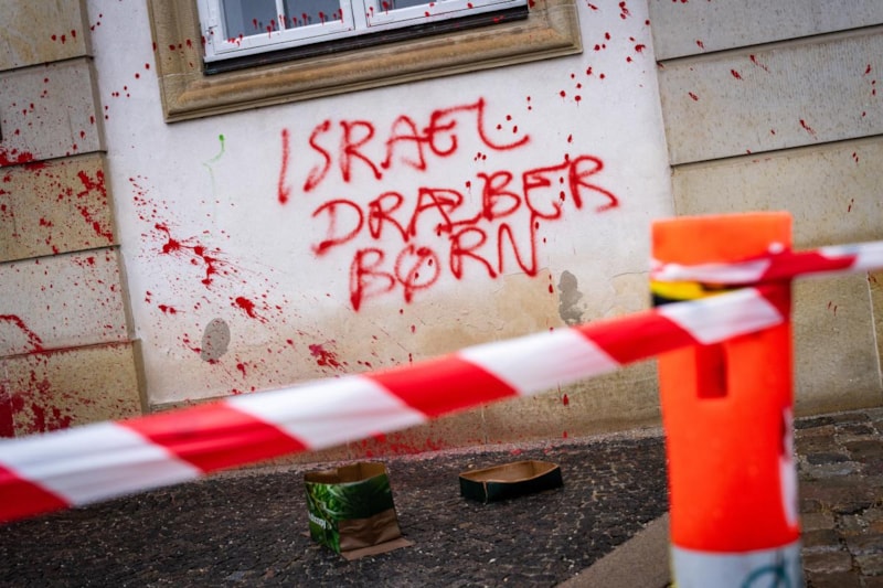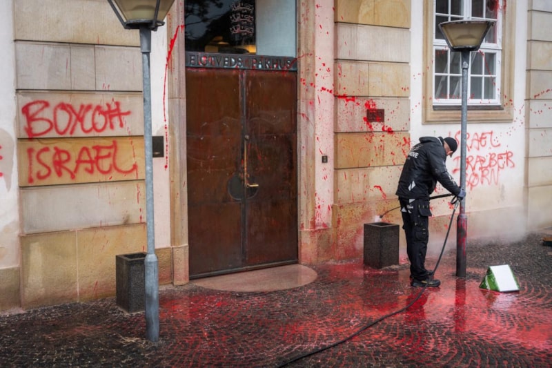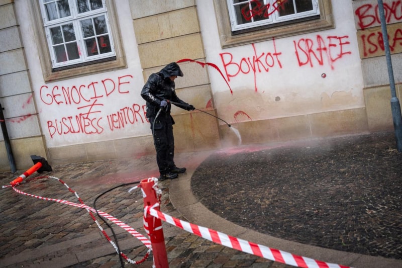 Başkent Kopenhag'da bir grup gösterici, Dışişleri Bakanlığı binasının duvarlarına kırmızı boya püskürterek, İsrail'in Gazze'ye yönelik saldırılarını protesto etti.