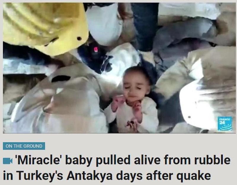France 24, depremin 133'üncü saatinde 2 yaşındaki Aliye Dağlı'nın kurtarılma anına tanıklık ederken, haberde şöyle denildi: