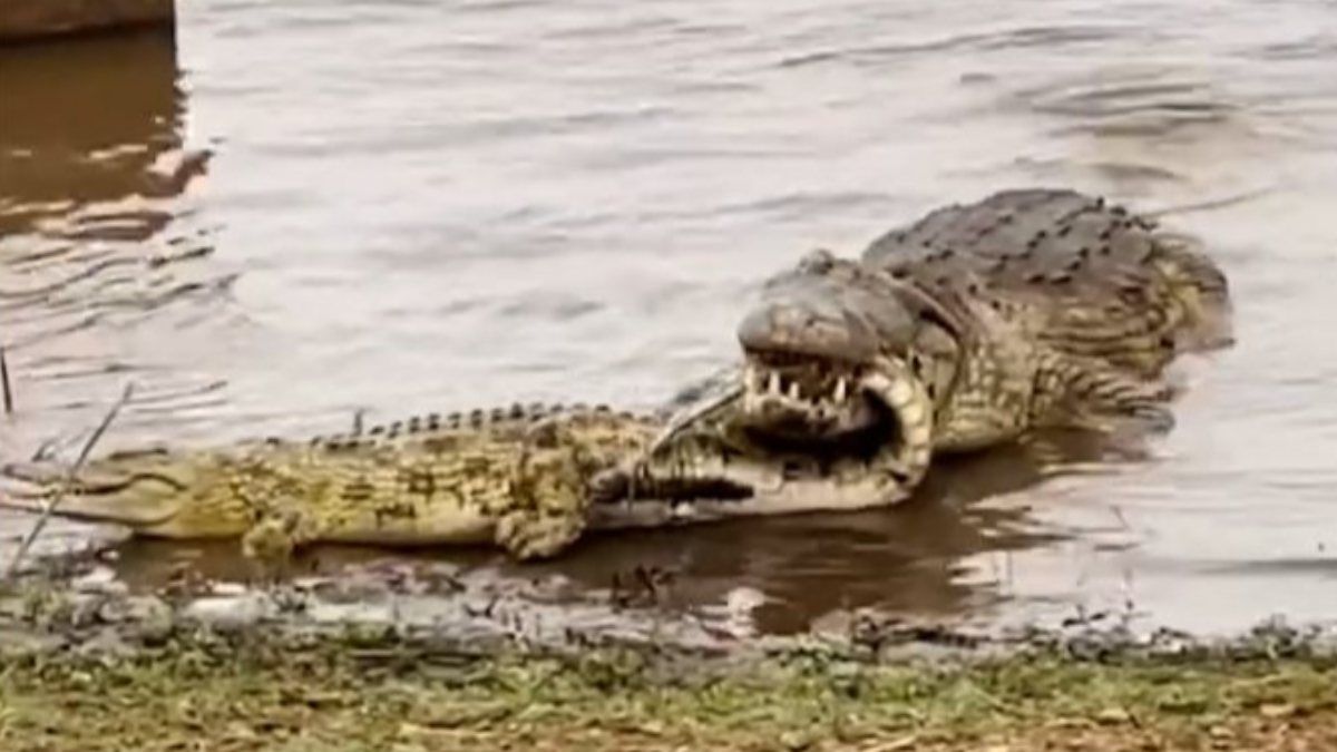 Dev timsah, yakaladığı ufak timsahı suyun içine çekerek gözden kaybolurken, o anlar saniye saniye kaydedildi.