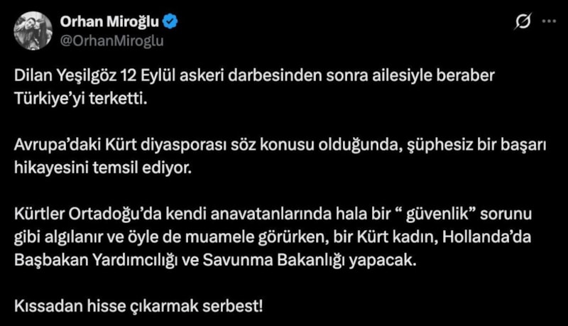 Tuncelili Dilan Yeşilgöz'ün Hollanda'da Başbakan Yardımcısı ve Savunma Bakanı görevine getirilmesine ilişkin bir paylaşımda bulunan Orhan Miroğlu'nun Kürtlerin Orta Doğu'da güvenlik sorunu gibi algılanırken Avrupa'da durumun farklı olduğunu iddia etmesi tepkilere neden oldu.