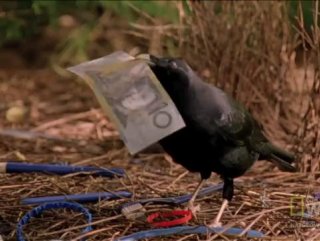 Çaresiz kuş, etrafta bulduğu şişe kapağından diş fırçasına, pipetten kaleme çok sayıda eşyayı dişisinin önüne taşıyor. Dişi kuş ise, para ve anahtar bile getiren erkeğine bana mısın demiyor.