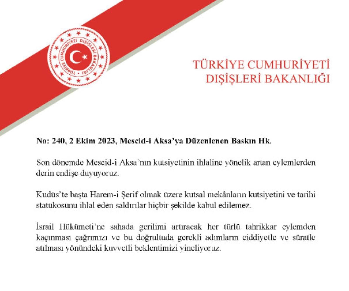 İsrail Hükümeti’ne sahada gerilimi artıracak her türlü tahrikkar eylemden kaçınması çağrımızı ve bu doğrultuda gerekli adımların ciddiyetle ve süratle atılması yönündeki kuvvetli beklentimizi yineliyoruz.