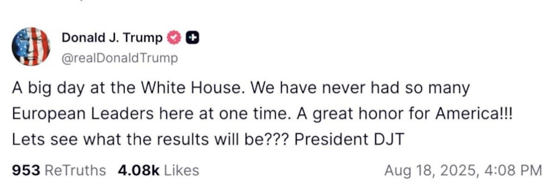 Donald Trump, Truth sosyal medya hesabından yaptığı paylaşımda, "Beyaz Saray'da büyük bir gün. Daha önce hiç bu kadar çok Avrupalı lider bir arada olmamıştı. ABD için büyük bir onur. Bakalım sonuçlar ne olacak?" dedi.