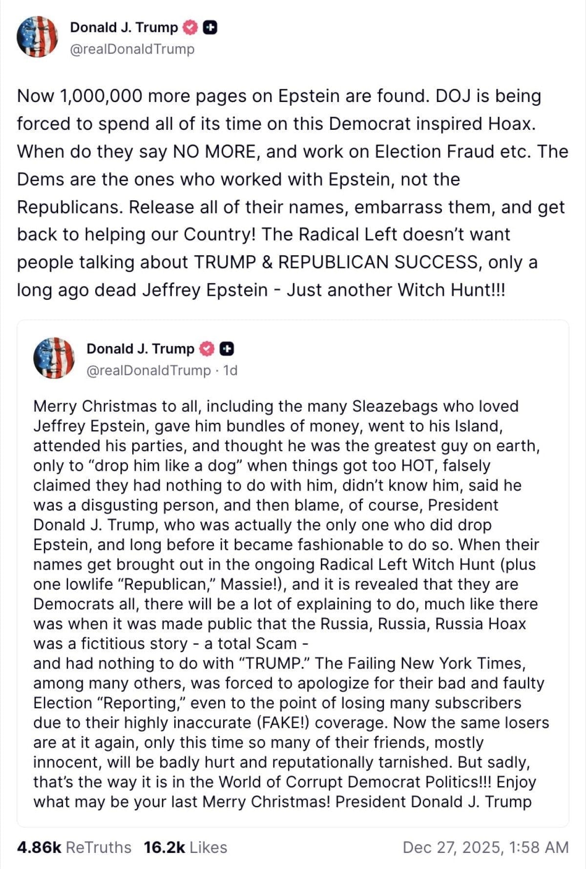 Adalet Bakanlığının Epstein davasına ilişkin 1 milyondan fazla sayfa yeni belge yayınladığına işaret eden Trump, "Adalet Bakanlığı tüm zamanını bu Demokrat ilhamlı oyuna harcamaya zorlanıyor. Ne zaman yeter artık deyip zamanlarını seçim yolsuzluğuna falan harcamaya başlayacaklar." değerlendirmesini yaptı.
