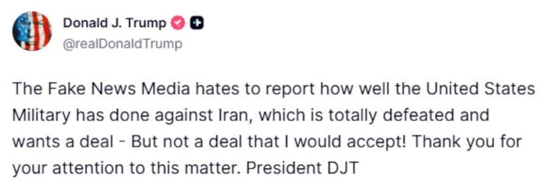 Trump, Truth sosyal medya platformu üzerinden yayınladığı mesajda ABD basınına sitem ederek, "Yalan haber medyası, ABD ordusunun tamamen yenilgiye uğrayan ve bir anlaşma yapmak isteyen İran karşısında ne kadar başarılı olduğunu haber yapmaktan nefret ediyor." dedi.
