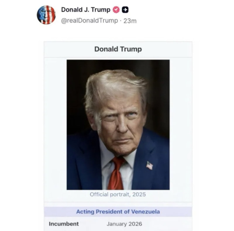 ABD Başkanı Donald Trump, sosyal medya paylaşımında kendisini "Venezuela'nın Başkan Vekili" şeklinde tanımladı.