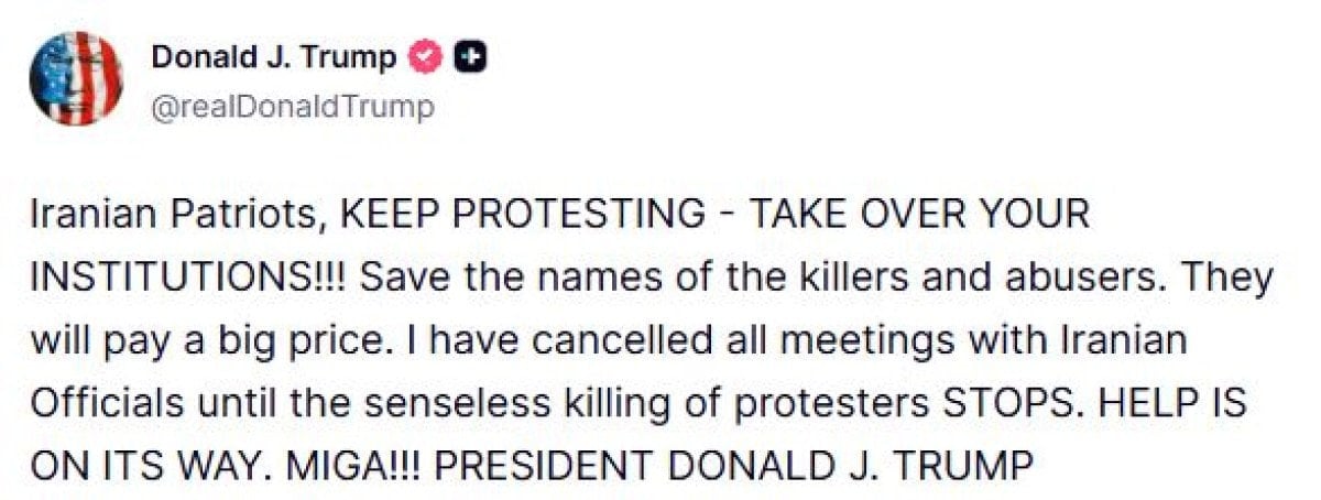 Trump, paylaşımında İran’daki gösterilere atıfta bulunarak, protestoculara seslendi.