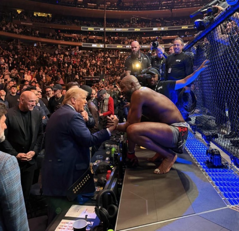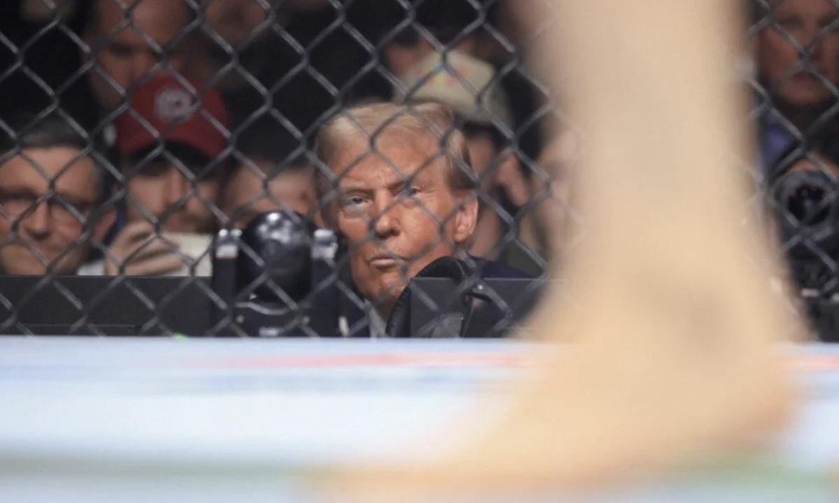 Trump, maçın sunucusuyla selamlaştı ve UFC yöneticisi Dana White’a sarıldı.