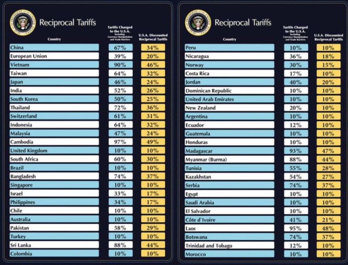 Bunlar arasında, Çin'e yüzde 34, Avrupa Birliği'ne yüzde 20, Vietnam'a yüzde 46, Tayvan'a yüzde 32, Japonya'ya yüzde 24, Hindistan'a yüzde 26 ve Türkiye'ye yüzde 10 oranında karşılıklı tarife uygulanması planlanıyor.