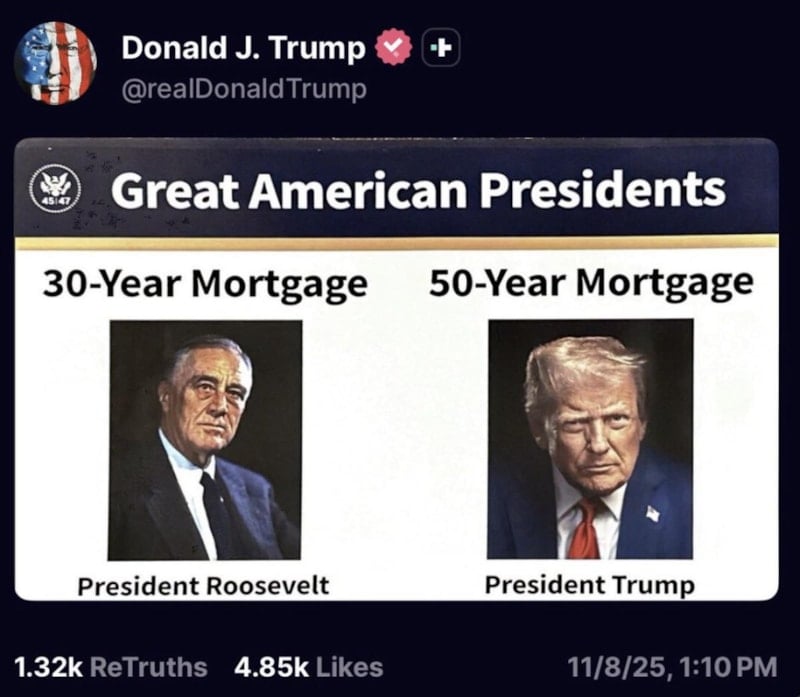 Trump ise Truth Social'ın bu girişimi Franklin D. Roosevelt'in Yeni Düzen dönemindeki 30 yıllık ipotek standardına benzettiği mesajını paylaştı.