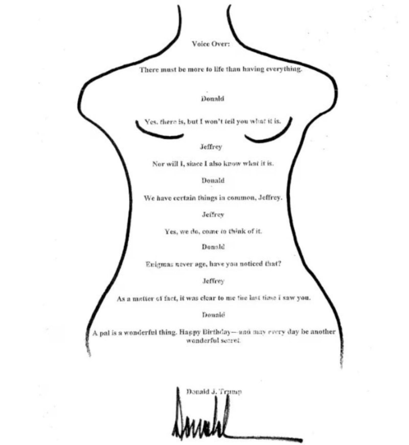Epstein'in avukatlarından elde edildiği belirtilen mektupta elle çizilmiş çıplak bir kadın siluetinin içinde Trump ile Epstein arasında geçen hayali bir konuşma metninin yer alması dikkat çekti.