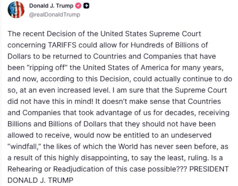 ABD Başkanı Donald Trump, ABD Yüksek Mahkemesi’nin gümrük vergilerini iptal eden kararının yıllarca ABD’yi sömüren ülkelere ve şirketlere haksız kazanç sağlayacağına dikkat çekerek "Bu davanın yeniden görülmesi veya yeniden karara bağlanması mümkün mü?" diye sordu.