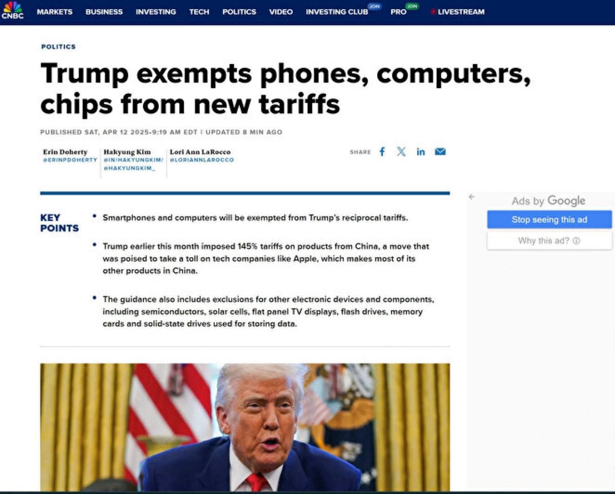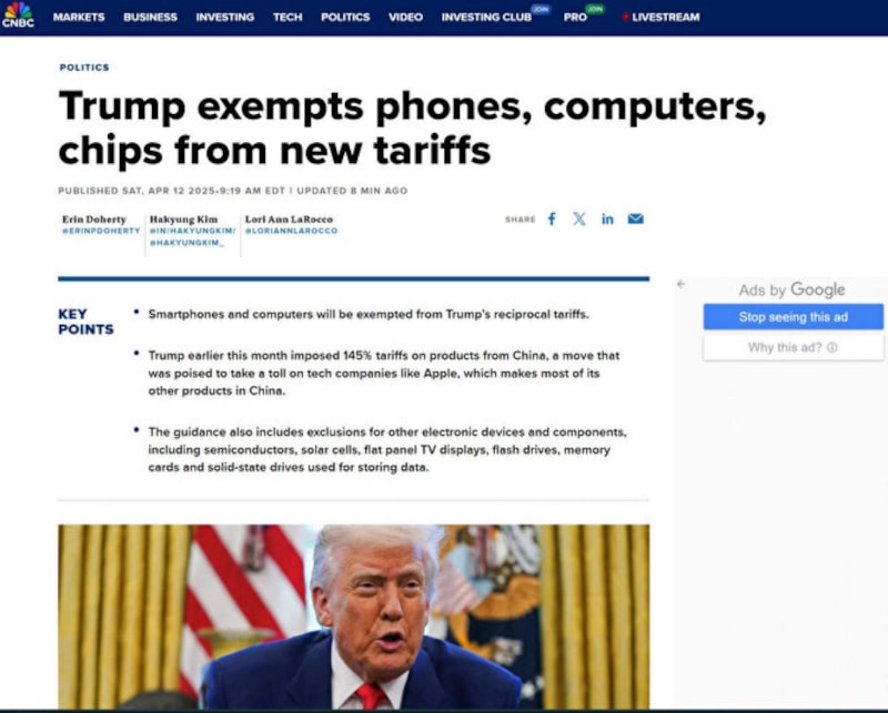 Yönergelere göre, yarı iletkenler, güneş panelleri, akıllı telefonlar, bilgisayarlar, düz ekran televizyon panelleri, flash bellekler ve hafıza kartları gibi birçok teknoloji ürünü ve bileşeninin söz konusu vergilerden muaf tutulacağı kaydedildi.