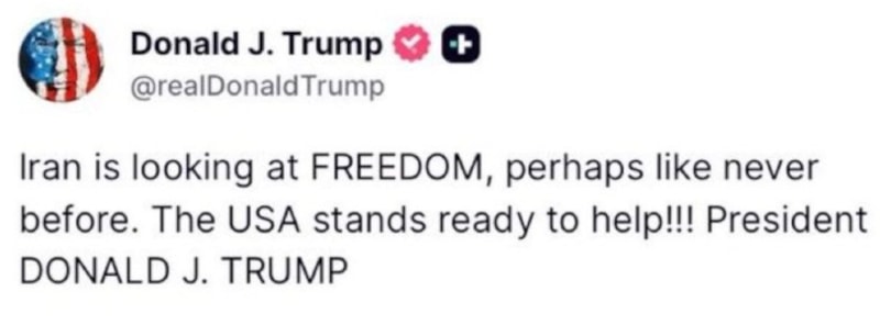 Sosyal medya hesabından açıklama yapan ABD Başkanı Trump "İran özgürlüğü hiç olmadığı kadar arıyor. Biz bu konuda yardım etmeye hazırız" dedi.