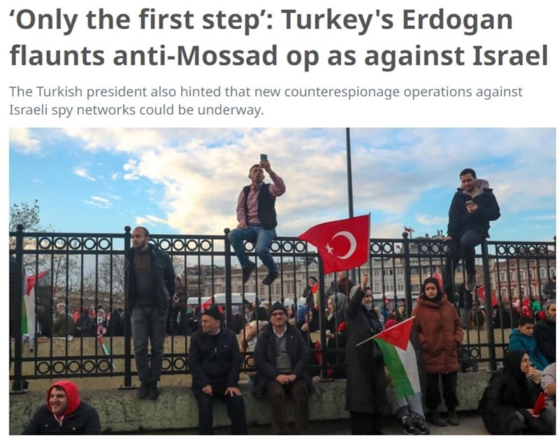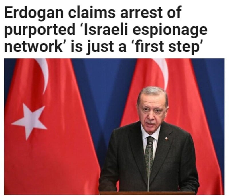 Haberde, "Erdoğan, İsrail casus ağlarına karşı yeni karşı casusluk operasyonlarının yapılabileceğini ima etti." notuna yer verildi.