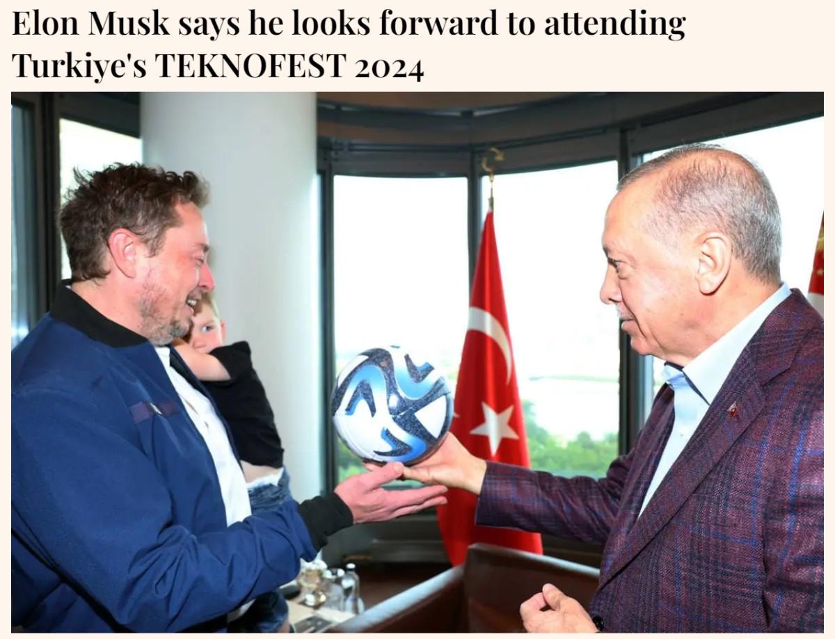 "Elon Musk, TEKNOFEST 2024'e katılmayı sabırsızlıkla bekliyor" diyen Middle East Monitor, Erdoğan'ın geçen hafta Musk'ı etkinliğe davet ettiğini anımsattı.