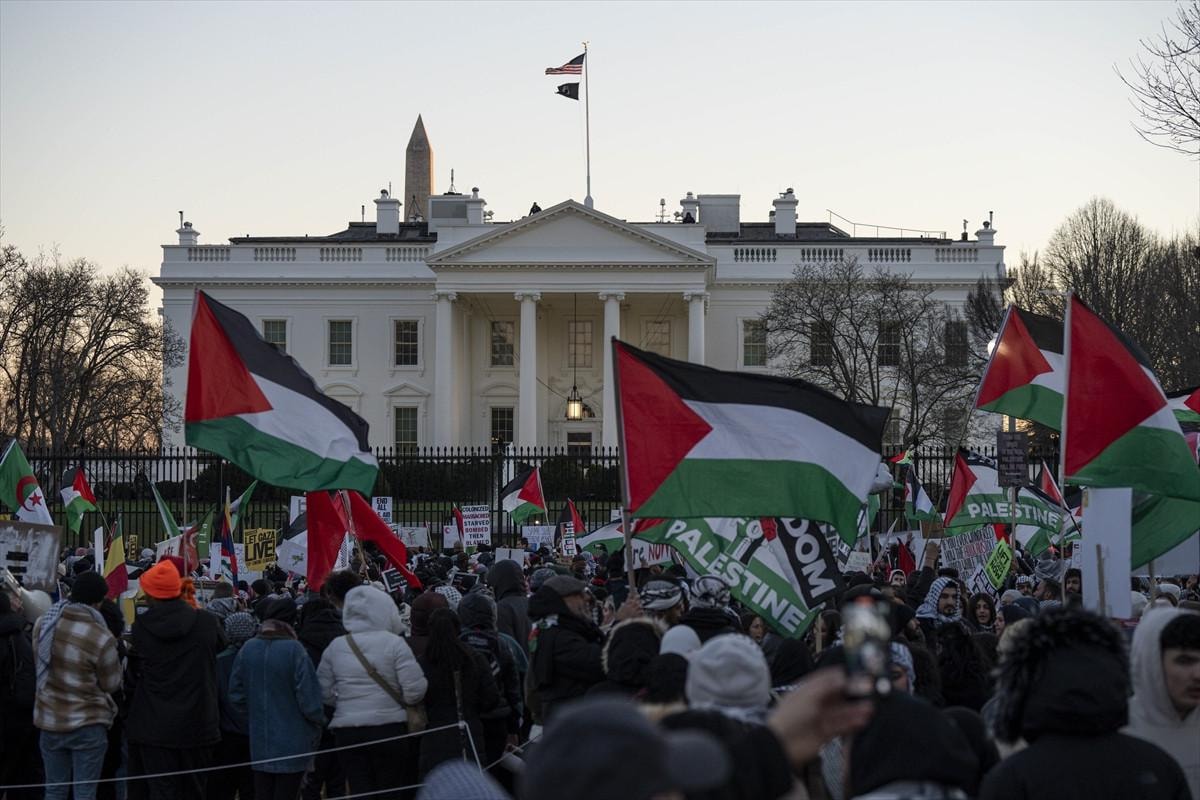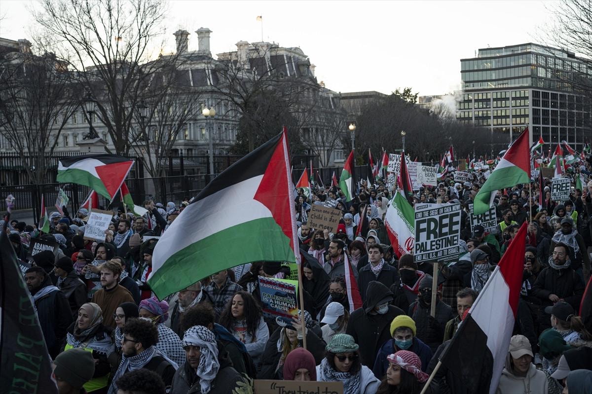 Göstericiler, ABD Başkanı Joe Biden'ı İsrail'in Gazze'deki savaşını finanse etmeyi durdurmaya ve Filistin topraklarının işgaline son verilmesini sağlamaya çağırdı.