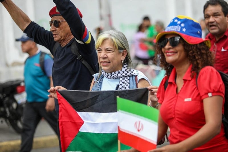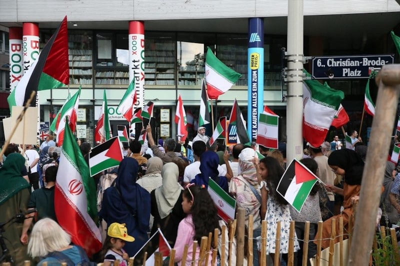 Göstericiler, İran bayrakları ile İsrail'in İran'a yönelik askeri operasyonlarını ve uluslararası baskıları protesto etti.