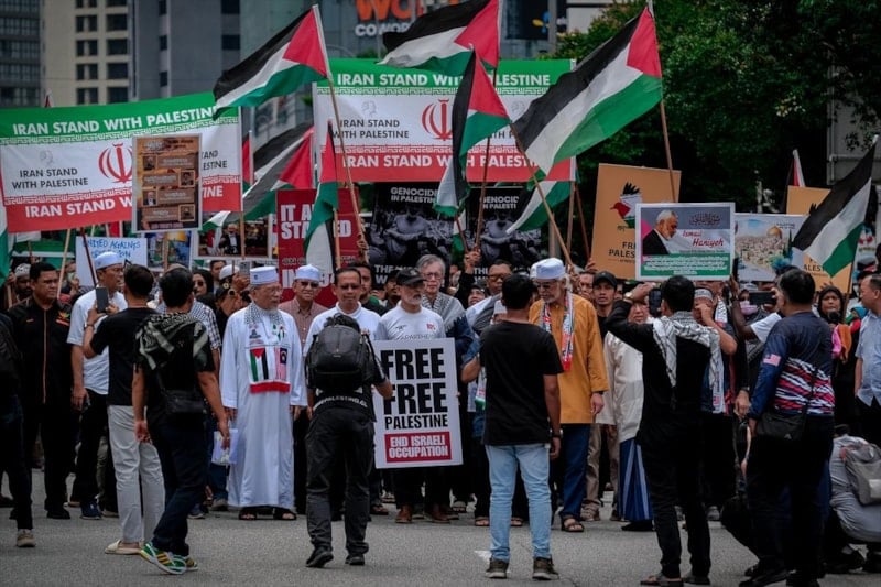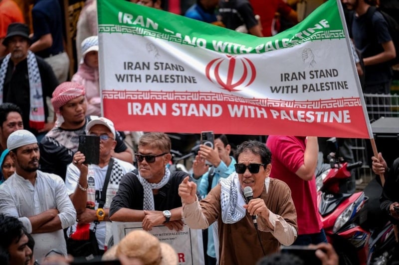 Malezya'nın başkenti Kuala Lumpur'da, Surau Tabung Camii önünde cuma namazı sonrası bir araya gelen yüzlerce kişi, İran'a destek gösterisi düzenledi.