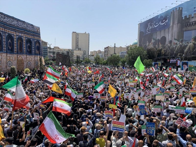 İran'ın başkenti Tahran'da, cuma namazı sonrası binlerce kişi, İnkılap Meydanı'nda toplanarak İsrail ve ABD aleyhine sloganlar attı.