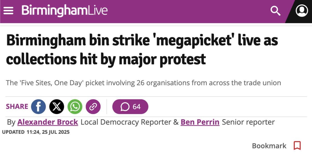 Bugün ise sendikaların ortak çağrısıyla “Beş Nokta, Bir Gün” adlı büyük destek eylemi düzenlendi. 26 farklı sendika, RMT, ASLEF, NEU, NASUWT ve BMA gibi önemli kuruluşlar grevdeki işçilere dayanışma gösterdi. Birmingham’ın Tyseley, Perry Barr ve Pershore/Sherlock Street bölgeleri ile Coventry’deki iki noktada iş bırakan işçiler, çöp kamyonlarının çıkışını engelleyerek toplu iş bırakma eylemi yaptılar. Şu an depoların kapıları kapalı, çöp araçları hareket etmiyor.